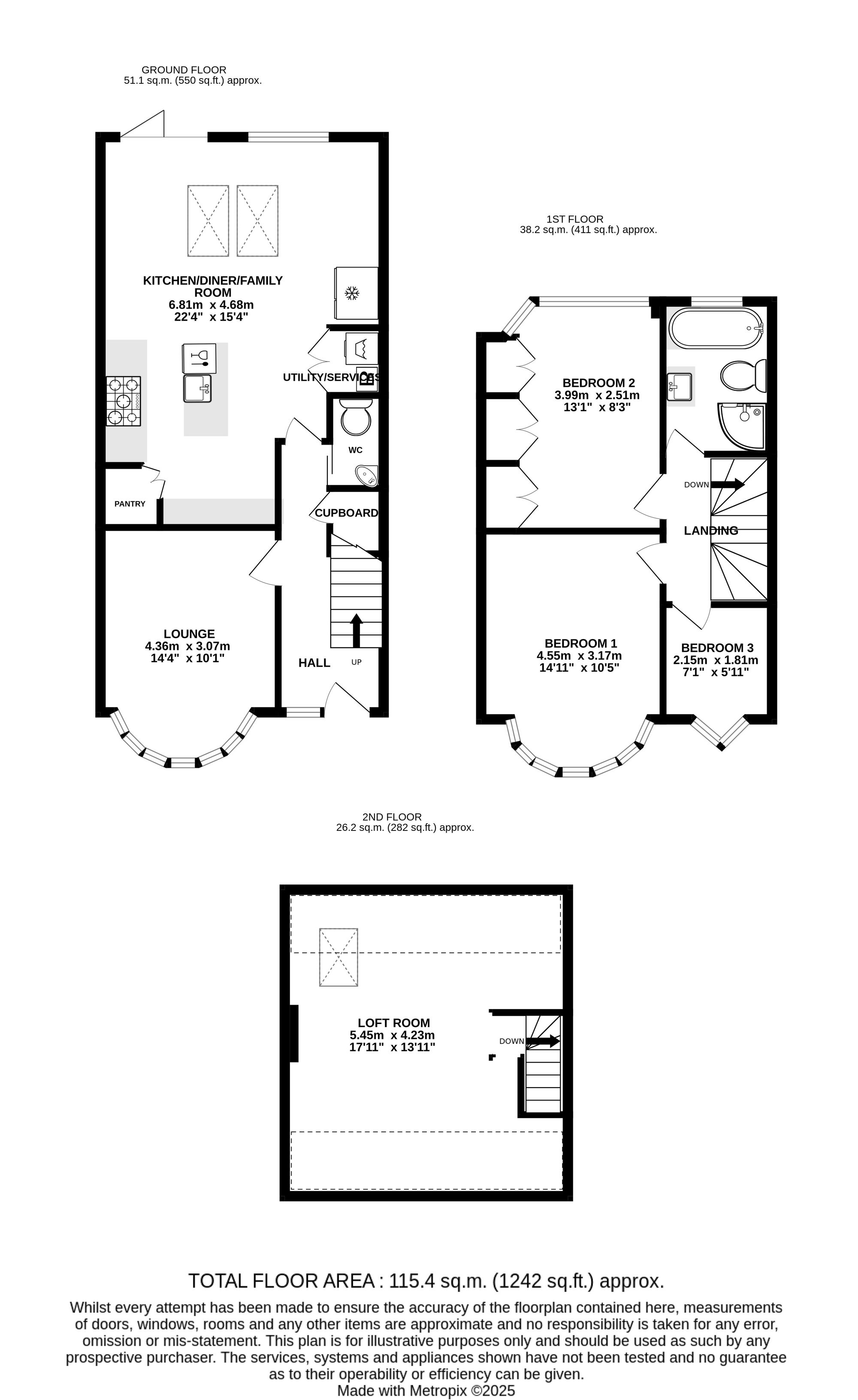 The property has been thoughtfully remodelled to create an open plan ground floor with distinct lounge and dining zones, and a kitchen with a peninsular breakfast bar. The kitchen is fitted with units and worktops, integral oven, combination microwave, gas hob, and dishwasher, with space for further appliances. Patio doors lead directly onto the rear garden. On the first floor are two double bedrooms and a third single bedroom, along with a refurbished family bathroom featuring a freestanding clawfoot bath with shower over, vanity basin, and WC. From the landing, a staircase leads to a useful loft room with Velux window and radiator, created by the current owners for use as an additional space for their children. Please note there is restricted head height on the staircase, meaning the loft is not compliant with current building regulations for habitable accommodation.